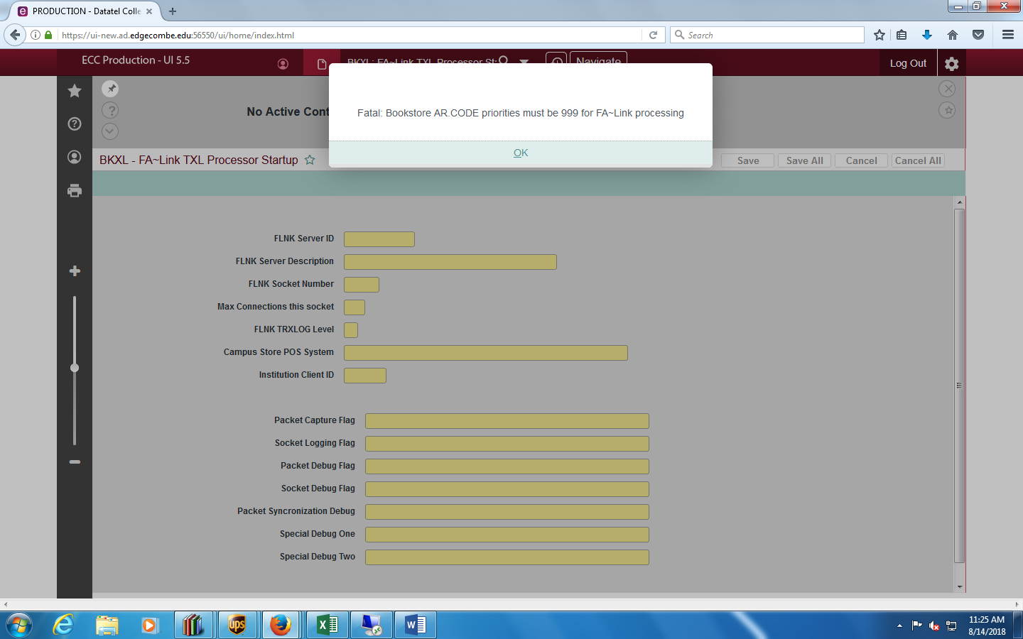Question:I just wanted you guys to see the error message. Thanks...._____________________8/14/18VPierce: Worked with Jeff Vickery at TrimData in the TEST environment. He reviewed BKCP and pointed out that the "Bookstore Category AR Codes" listed when you drill down must have a priority of 999. He says that this has always been the rule.